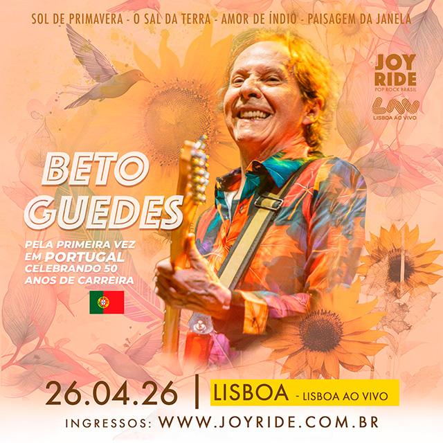 Beto Guedes celebra 50 anos de carreira com dois shows inéditos em Portugal! Os fãs de Portugal do cantor, compositor e multi-instrumentista Beto Guedes — parceiro de Lô Borges e Milton Nascimento no lendário Clube da Esquina — serão os primeiros do continente europeu a ter a oportunidade de assisti-lo ao vivo, apresentando o espetáculo comemorativo de seus 50 anos de carreira.